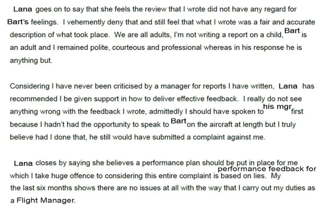 Cabin Crew Manager Hayley took six weeks to complete her investigation but didn’t speak to anyone either. The Head of Cabin Crew could also have questioned Bart and other crew members, but in the eight weeks that it took her to complete her investigation, she also spoke to no one.