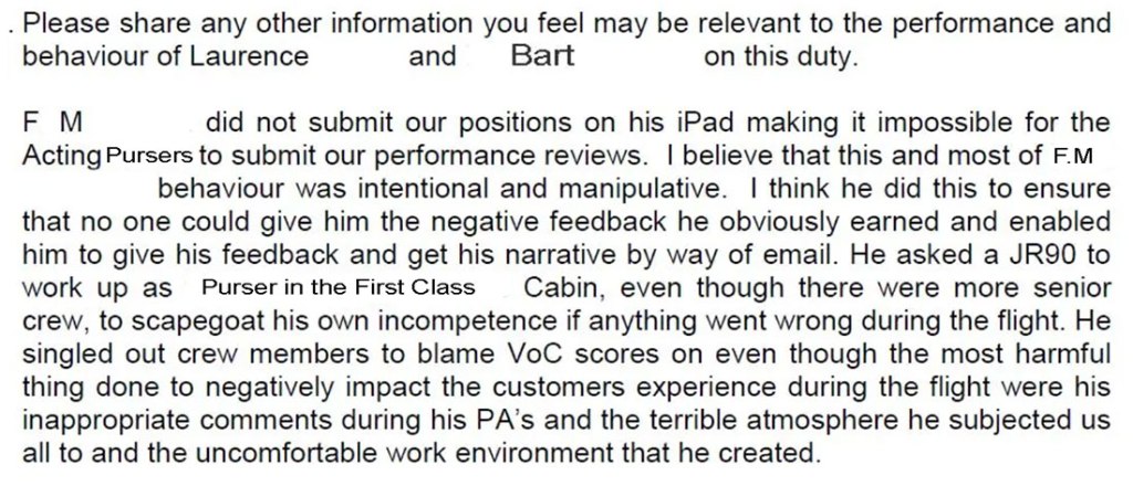 Tommy, who was working up as Purser in Economy, didn’t complete any performance feedback for either sector despite it being mandatory. He was required to complete feedback on Anna, Mia, Peter, and a fourth crew member who didn’t return her witness statement. He was also required to do upward feedback on me. Katrina, who worked as First Class Purser completed feedback on Bart, Claire and Lottie, and also did upward feedback on me.