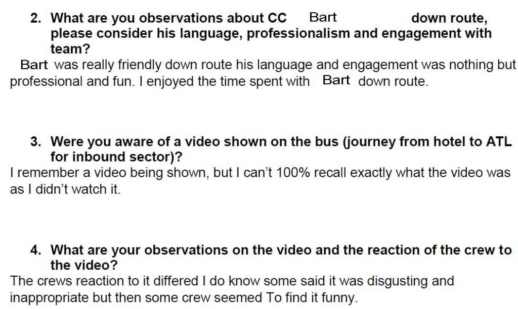 So the only person left who could have commented on the video was the female crew member who didn’t return her statement. I’m assuming Anna and Bart both found it offensive but since they don’t mention it we don’t know for certain.